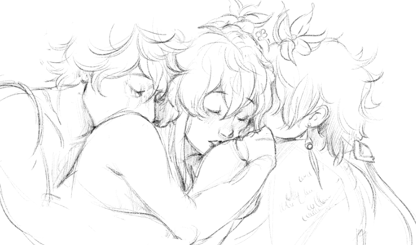 their legs are all a warm tangle, and the three of them together are an endless canvas of warm, naked skin, one of her arms flung across zhongli's chest, the opposite hand tangled up with childe's, fingers entwined. a sleepy smile curves her mouth as lumine shifts onto her back, pressing a kiss to zhongli's shoulder before her hand looses from childe's to sift through his wild ginger bedhead. her time in teyvat may be bittersweet in many ways, but right now, here, warm in this place, surrounded by the people she loves.. lumine cannot imagine a happier moment. her voice is thick and rough with sleep when she speaks. ]